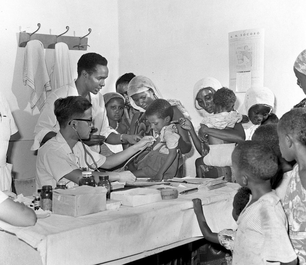 1968年4月,中國醫(yī)療隊(duì)醫(yī)生在索馬里阿弗戈依鎮(zhèn)巡回醫(yī)療時(shí)為當(dāng)?shù)貎和尾 ?/p>