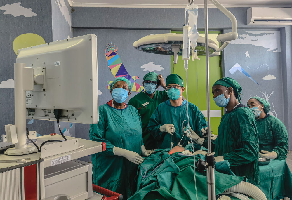 2022年10月26日,中國援坦桑尼亞醫(yī)療隊(duì)小兒外科醫(yī)生丁國建(中)在坦桑尼亞達(dá)累斯薩拉姆的穆欣比利國立醫(yī)院實(shí)施小兒腹腔鏡手術(shù)(手機(jī)照片)。
