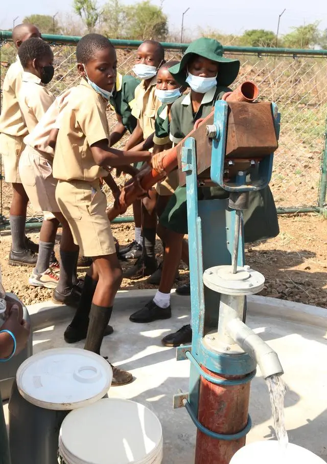 2021年11月,在津巴布韋南馬塔貝萊蘭省省會關(guān)達(dá)的塞農(nóng)多小學(xué),學(xué)生從中國援建水井里打水。