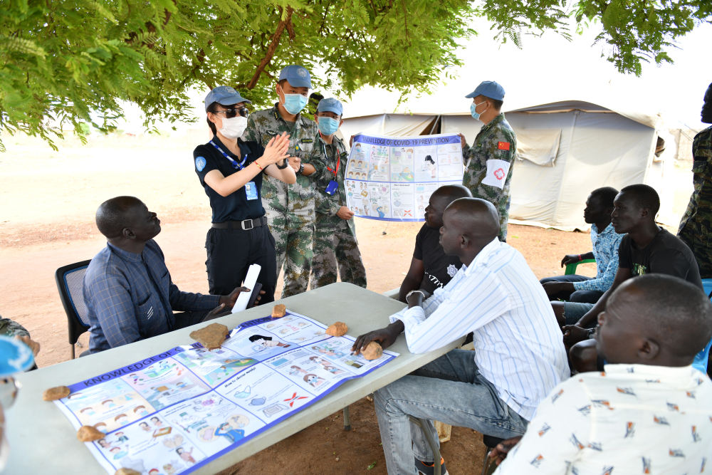 2020年3月,在南蘇丹首都朱巴,執(zhí)行聯(lián)合國(guó)維和任務(wù)的中國(guó)維和警察廖潔給當(dāng)?shù)鼐熘v解防疫知識(shí)。
