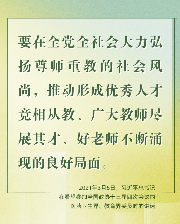 因?yàn)闊釔?,所以一生?jiān)持。老師是中華民族“夢(mèng)之隊(duì)”的筑夢(mèng)人,是新時(shí)代的“大先生”。從傳播知識(shí)、啟迪思想、無(wú)私奉獻(xiàn),到“讓每個(gè)人都有實(shí)現(xiàn)夢(mèng)想的機(jī)會(huì)”;從教書到育人,從個(gè)人到家國(guó),從小我到大我,“培養(yǎng)德智體美勞全面發(fā)展的社會(huì)主義建設(shè)者和接班人”,老師,已然是喚起一代代學(xué)子追隨先輩、培養(yǎng)家國(guó)情懷、櫛風(fēng)沐雨、砥礪前行的力量。