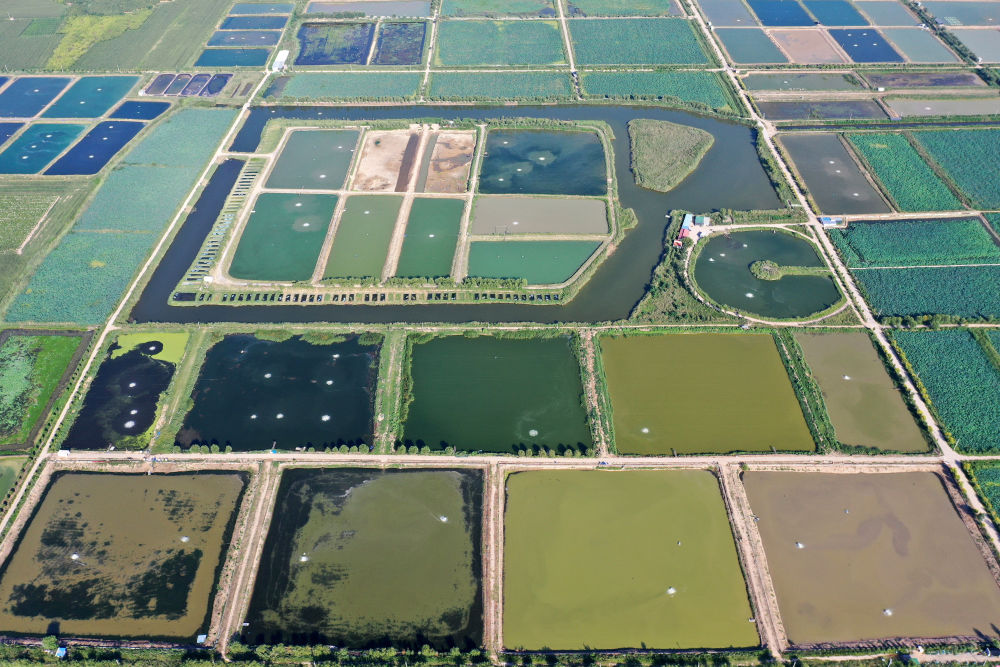 2024年8月13日在山西省臨猗縣薛公村拍攝的蟹塘(無(wú)人機(jī)照片)。薛公村位于黃河岸邊,有5000多畝黃河灘涂和近5000畝荒溝。當(dāng)?shù)赝ㄟ^(guò)將荒溝和灘涂進(jìn)行整合,發(fā)展特色水產(chǎn)養(yǎng)殖,讓守著黃河水、住在黃河灘的薛公村村民有了新的致富路。