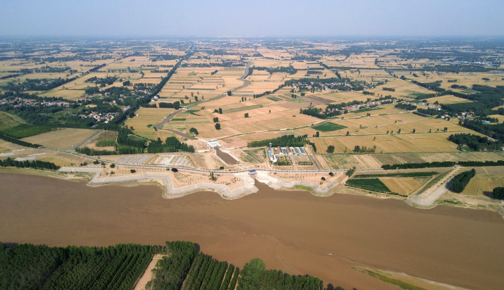 2024年6月19日,位于黃河高青段的馬扎子引黃閘開(kāi)閘引水(無(wú)人機(jī)照片)。5月1日至6月18日,山東省累計(jì)啟用引黃閘63座,引黃河水量10.06億立方米,保障農(nóng)業(yè)灌溉需求。