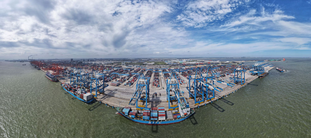 2024年6月13日,途經(jīng)馬來西亞關(guān)丹港的“海豐博多”輪在廣西欽州港集裝箱裝卸自動化碼頭進(jìn)行裝卸作業(yè)(無人機(jī)全景照片)。