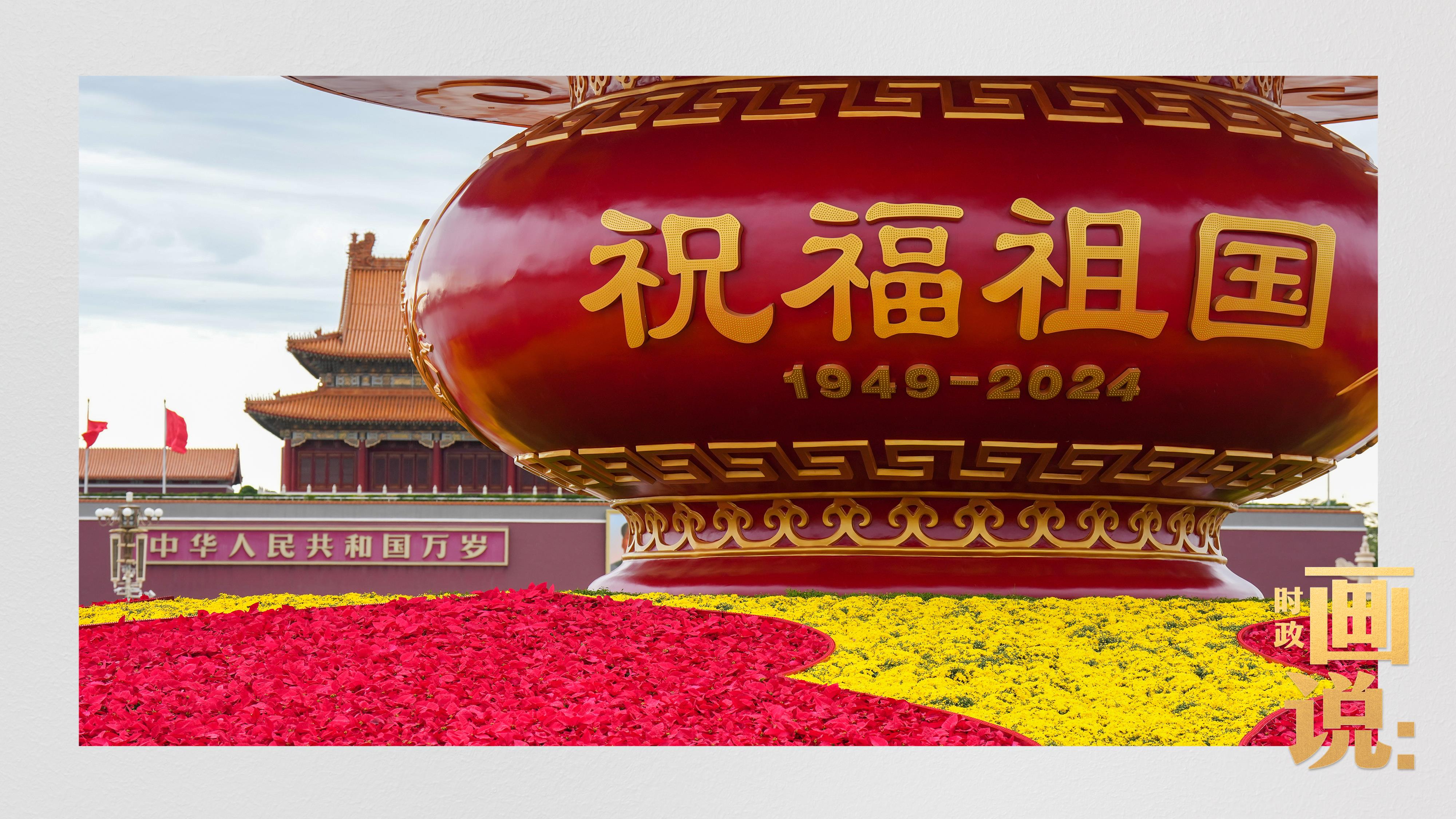 天安門廣場(chǎng)中央,“祝福祖國(guó)”巨型花籃表達(dá)著對(duì)國(guó)家繁榮富強(qiáng)的美好祝福。