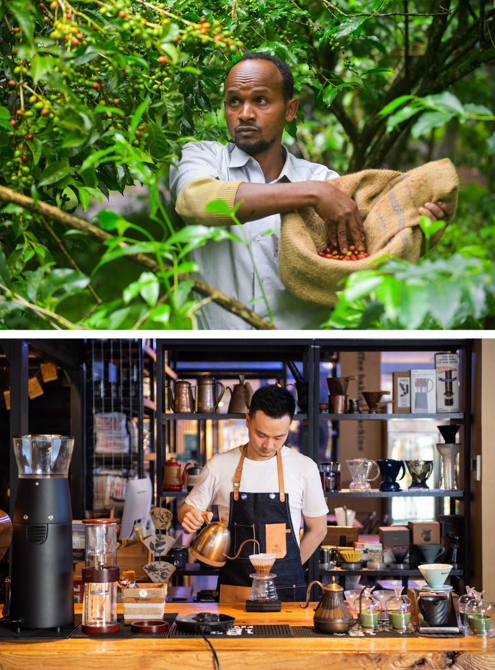 上圖:2021年9月22日,在埃塞俄比亞奧羅米亞州戈馬地區(qū)的一個(gè)咖啡園,農(nóng)民胡森·穆罕默德在采摘咖啡豆;下圖:2021年9月24日,在湖南省長(zhǎng)沙市高橋大市場(chǎng)非洲咖啡街一家咖啡館,咖啡師彭杰在制作咖啡飲品。隨著中國(guó)開放的大門越開越大、中國(guó)咖啡消費(fèi)的快速增長(zhǎng),埃塞俄比亞咖啡在中國(guó)越來(lái)越受歡迎。