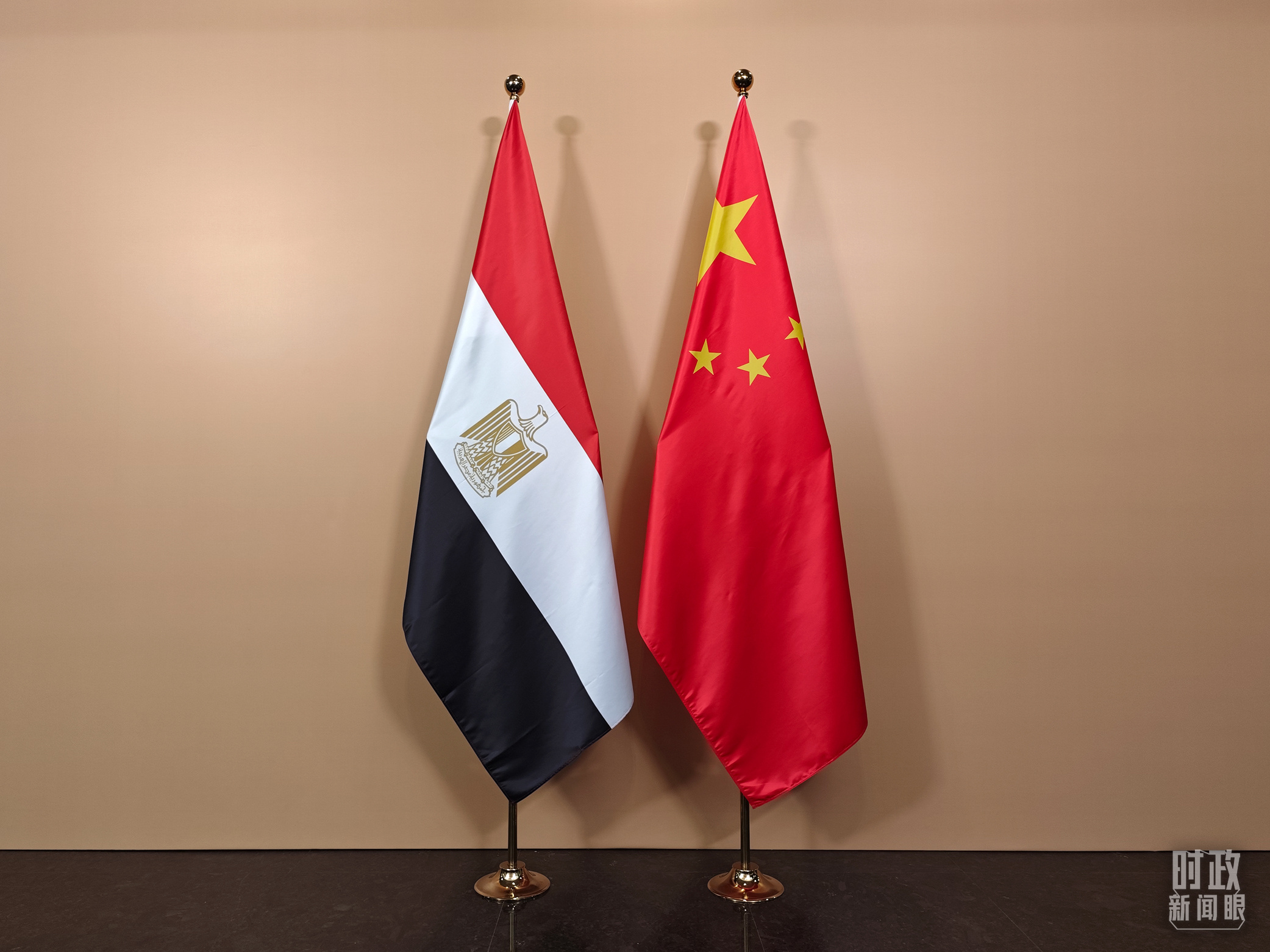 會(huì)見廳外的中國埃及兩國國旗。(總臺(tái)央視記者彭漢明拍攝)