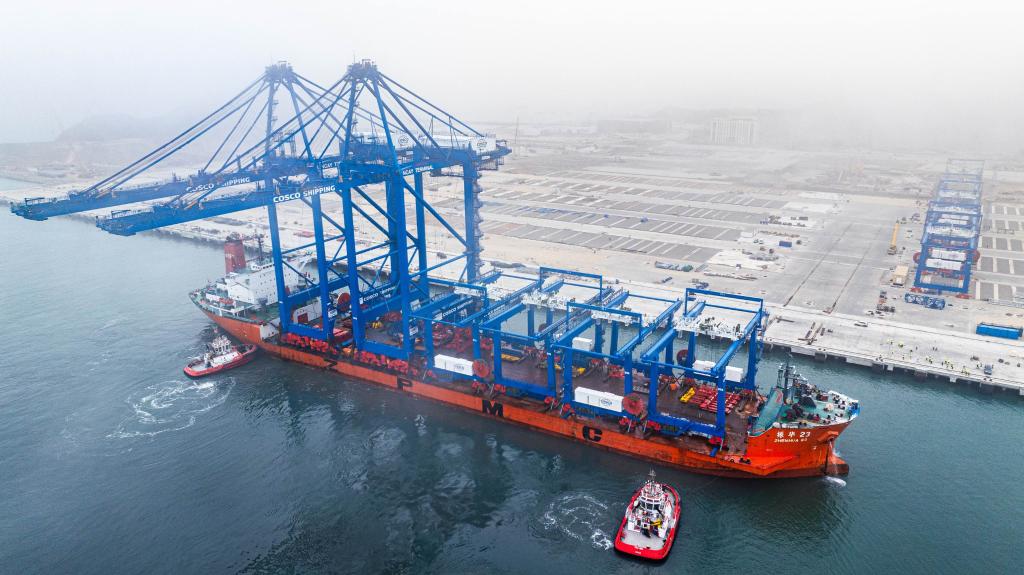 6月27日,岸邊集裝箱起重機和軌道吊運抵秘魯錢凱港。新華社發(fā)(上海振華重工供圖)