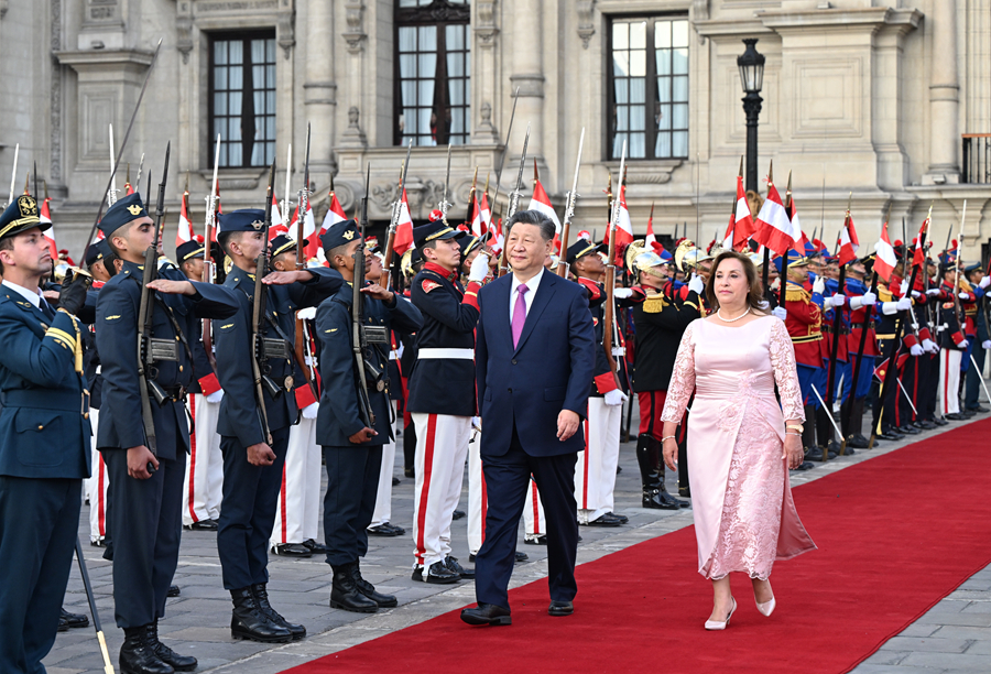 當(dāng)?shù)貢r(shí)間11月14日下午,國家主席習(xí)近平在利馬總統(tǒng)府同秘魯總統(tǒng)博魯阿爾特舉行會(huì)談。博魯阿爾特在總統(tǒng)府前廣場(chǎng)為習(xí)近平舉行隆重盛大歡迎儀式。新華社記者 謝環(huán)馳 攝