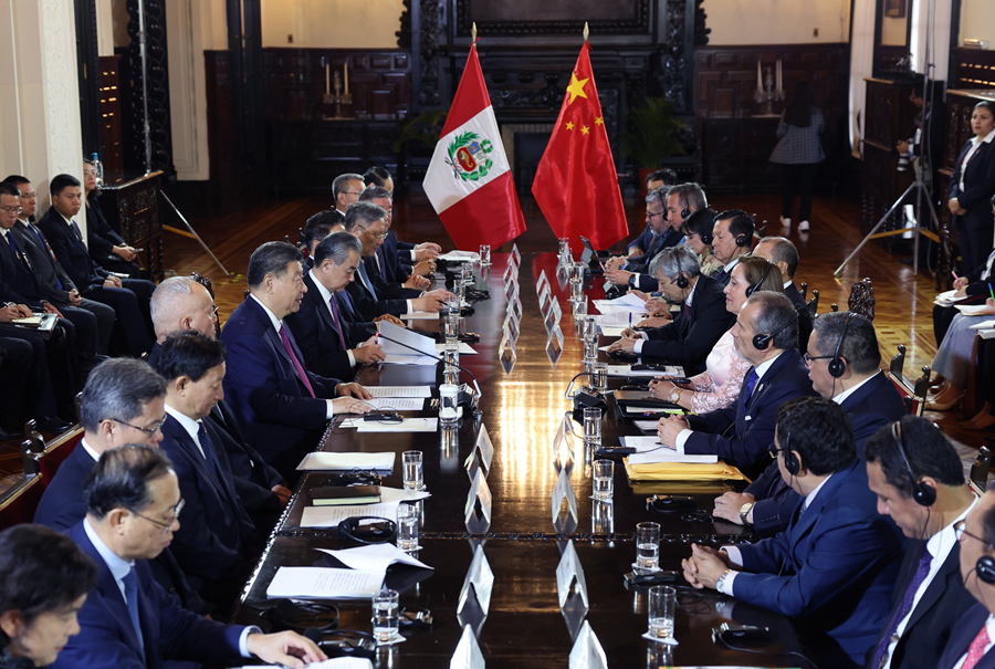 當(dāng)?shù)貢r(shí)間11月14日下午,國家主席習(xí)近平在利馬總統(tǒng)府同秘魯總統(tǒng)博魯阿爾特舉行會(huì)談。新華社記者 姚大偉 攝