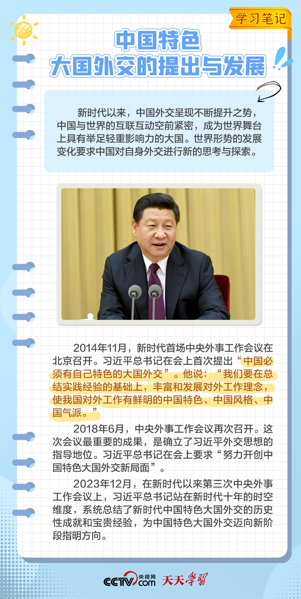 天天學(xué)習(xí)2014年11月,習(xí)近平總書(shū)記在中央外事工作會(huì)議上指出,中國(guó)必須有自己特色的大國(guó)外交。