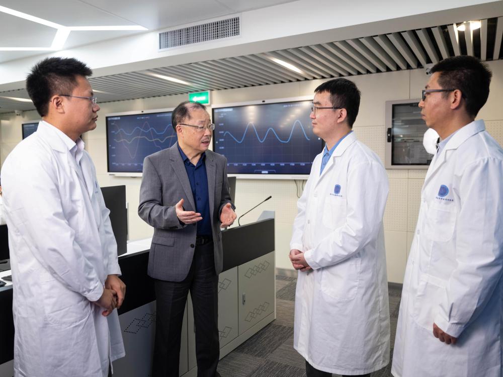 12月4日,澳門空間技術(shù)與應(yīng)用研究院院長(zhǎng)張可可(左二)和“澳科一號(hào)”衛(wèi)星項(xiàng)目助理研究員尹亮(右二)交流。新華社發(fā)(張金加 攝)