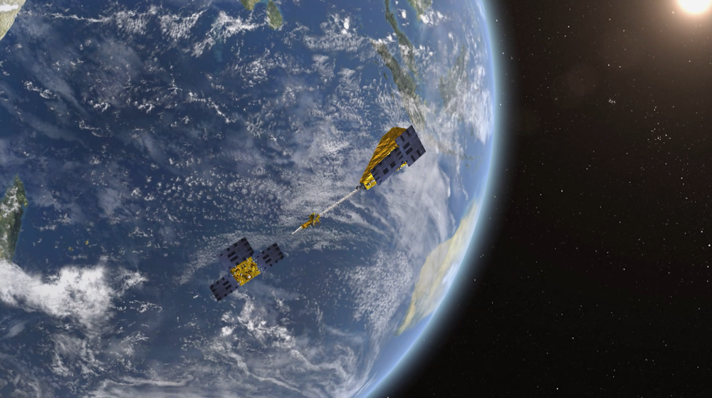 “澳科一號”衛(wèi)星在軌示意圖(右為A星,左為B星)。圖片由澳門科技大學“澳科一號”團隊提供
