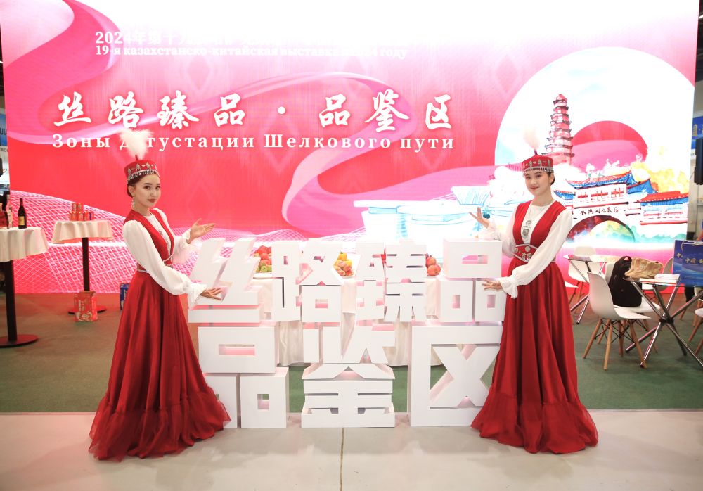 2024年8月23日,在哈薩克斯坦阿斯塔納,身著民族服飾的工作人員在第十九屆哈薩克斯坦—中國(guó)商品展覽會(huì)上歡迎觀(guān)展民眾。新華社發(fā)(奧斯帕諾夫攝)