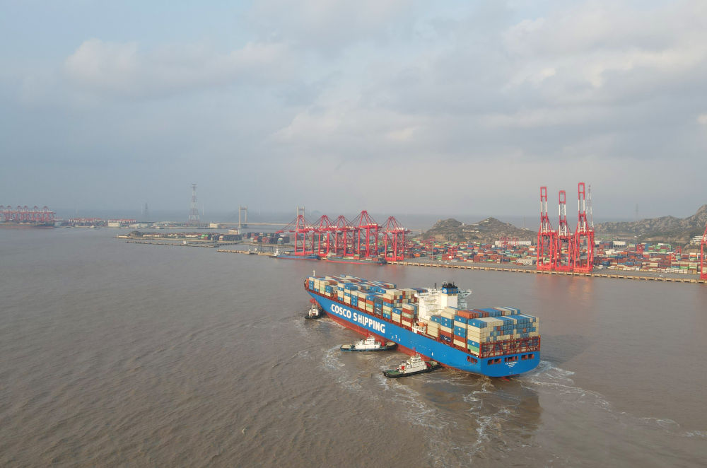 “新上?!陛喌诌_(dá)洋山港,這是自秘魯錢(qián)凱港開(kāi)港后首個(gè)“錢(qián)凱—上?!闭胶酱危?024年12月18日攝,無(wú)人機(jī)照片)。新華社記者 方喆 攝