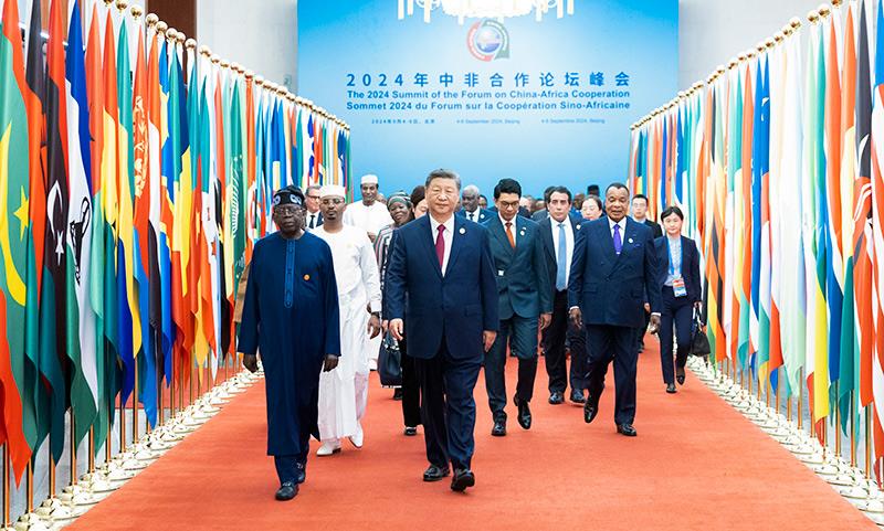 △2024年9月5日,習(xí)近平主席在北京人民大會(huì)堂出席中非合作論壇北京峰會(huì)開幕式并發(fā)表主旨講話。這是習(xí)主席同外方領(lǐng)導(dǎo)人共同步入會(huì)場(chǎng)。