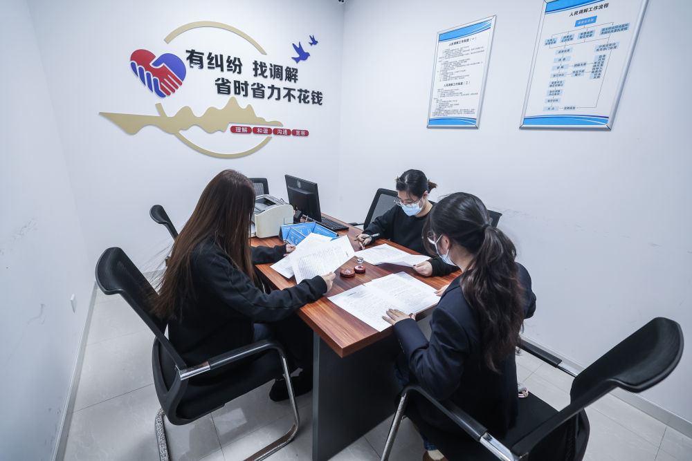 2025年2月25日,在浙江省嘉興市南湖區(qū)社會矛盾糾紛調處化解中心,調解員(右一)在調解金融借款合同糾紛。新華社記者 徐昱 攝