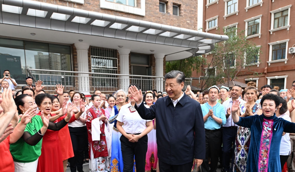 2022年7月13日上午,習(xí)近平在新疆烏魯木齊市天山區(qū)固原巷社區(qū)考察時,身著民族服裝的各族群眾簇?fù)碓诳倳浬磉?,載歌載舞,向總書記表達(dá)由衷的愛戴。