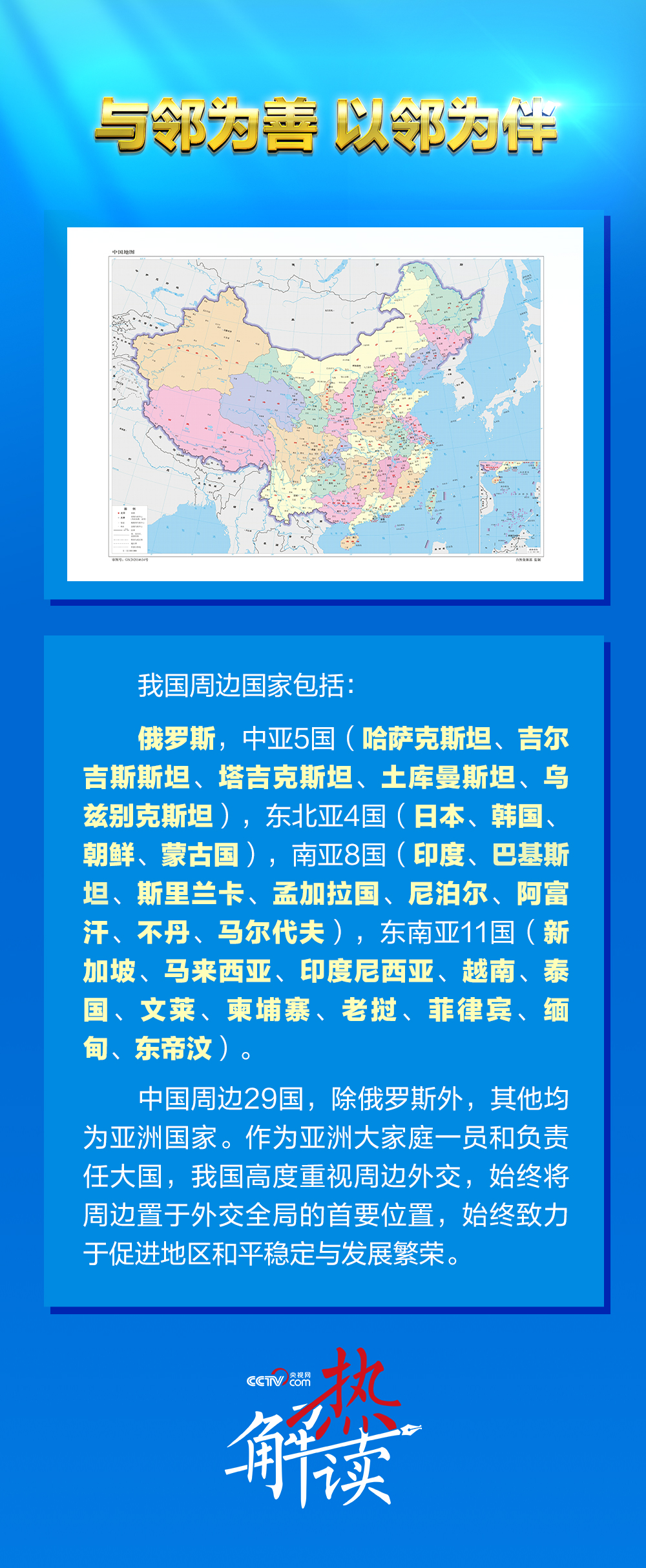 2013年10月,在新中國成立以來召開的首次周邊外交工作座談會上,習(xí)近平主席深刻指出,無論從地理方位、自然環(huán)境還是相互關(guān)系看,周邊對我國都具有極為重要的戰(zhàn)略意義。在那次會議上,習(xí)主席明確提出我國周邊外交基本方針——堅持與鄰為善、以鄰為伴,堅持睦鄰、安鄰、富鄰,突出體現(xiàn)親、誠、惠、容的理念。