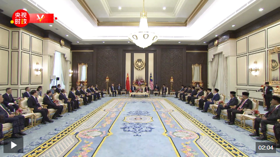 4月16日上午,馬來西亞最高元首易卜拉欣在馬來西亞國家王宮同中國國家主席習(xí)近平舉行會見。