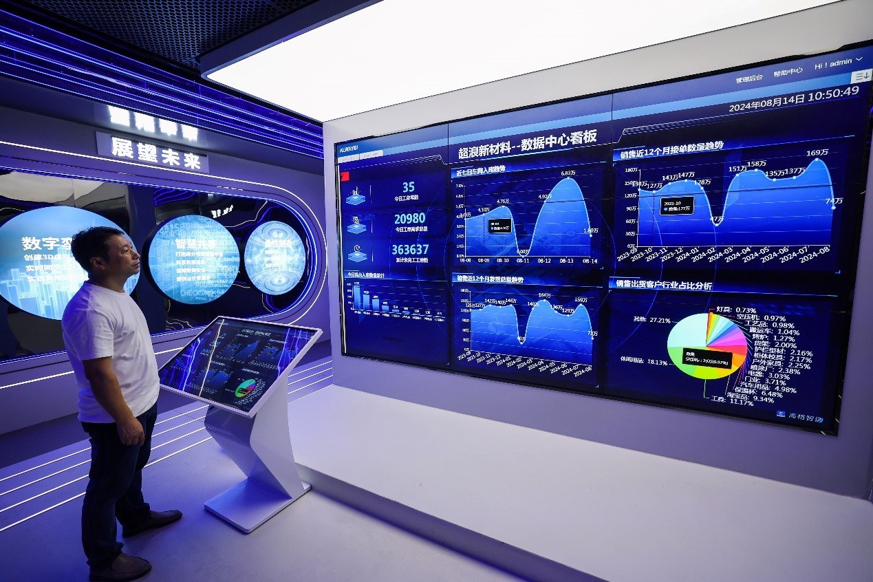 在金華市金東區(qū)江東鎮(zhèn)的浙江超浪新材料有限公司內,數據中心看板實時顯示企業(yè)流水線的各項生產數據。新華社記者 徐昱 攝