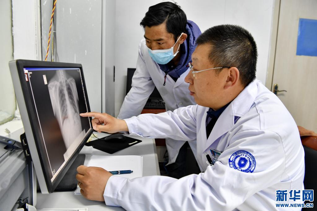 4月21日,山東省煙臺市第五批援藏醫(yī)療隊成員趙文雷(右)指導當?shù)蒯t(yī)院放射科助理醫(yī)師普布次仁看片。新華社記者 張汝鋒 攝