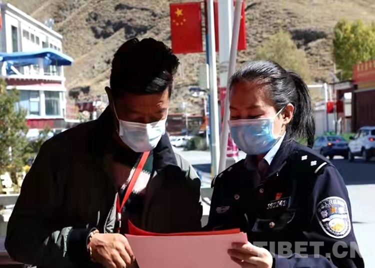 “出家門,戴口罩,少聚會(huì),少串門,非常時(shí)期要留神。勤洗手,講衛(wèi)生,室內(nèi)開窗多通風(fēng)。舊口罩,要收起,有害垃圾要處理……”民警珠央正在使用漢藏雙語向駐地群眾宣講防疫口訣。