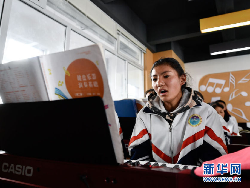 3月16日,在果洛藏族自治州職業(yè)技術(shù)學(xué)校,2020級學(xué)前教育專業(yè)學(xué)生楊央在上音樂課。新華社記者 張龍 攝