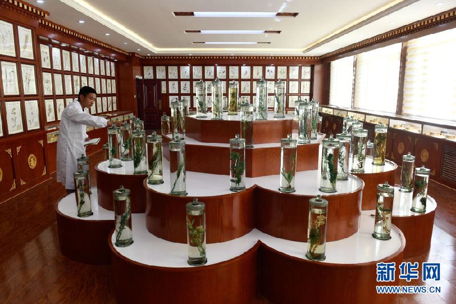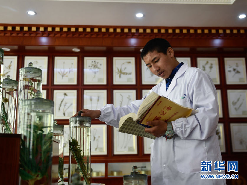 3月16日,在果洛藏族自治州職業(yè)技術(shù)學(xué)校,2020級藏醫(yī)醫(yī)療與藏藥專業(yè)學(xué)生德欽多杰在草藥標(biāo)本館內(nèi)辨認(rèn)藥材。新華社記者 張龍 攝