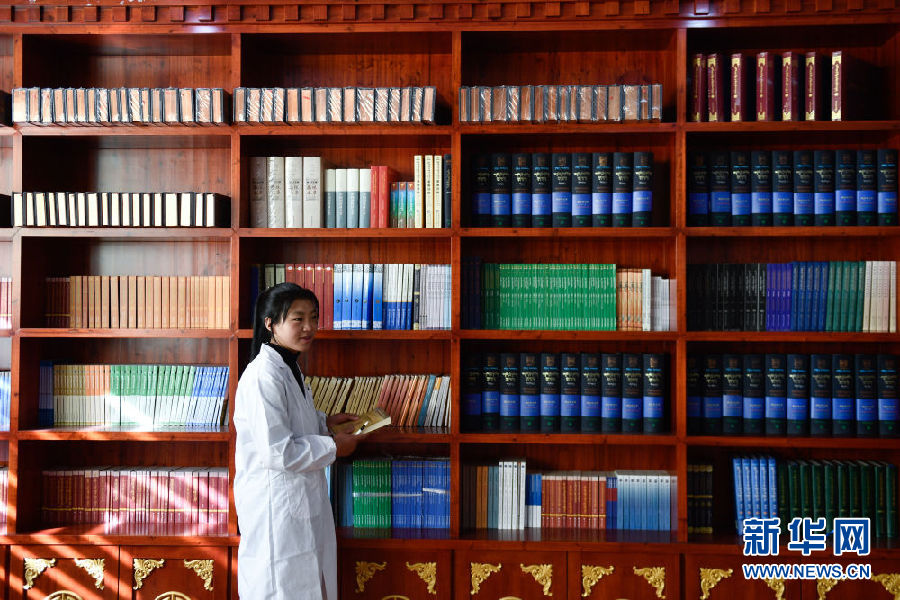 3月16日,在果洛藏族自治州職業(yè)技術(shù)學(xué)校,2020級藏醫(yī)醫(yī)療與藏藥專業(yè)學(xué)生德吉在借閱書籍。新華社記者 張龍 攝