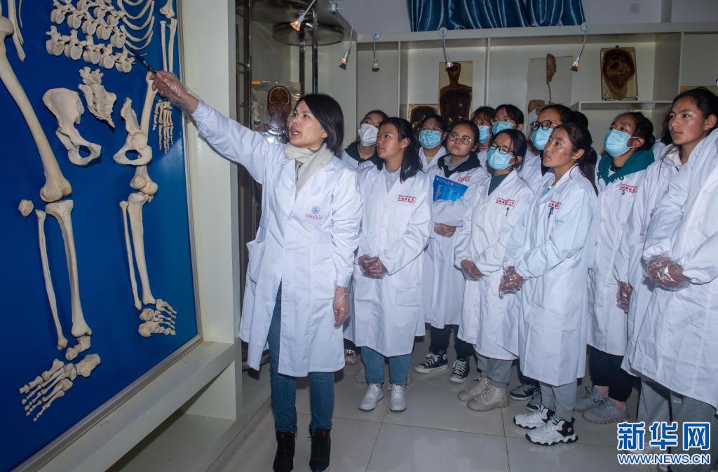 西藏藏醫(yī)藥大學(xué)藏醫(yī)系現(xiàn)代醫(yī)學(xué)教研室宗詠花老師在講解人體骨骼構(gòu)造(3月23日攝)。新華社記者 旦增尼瑪曲珠 攝