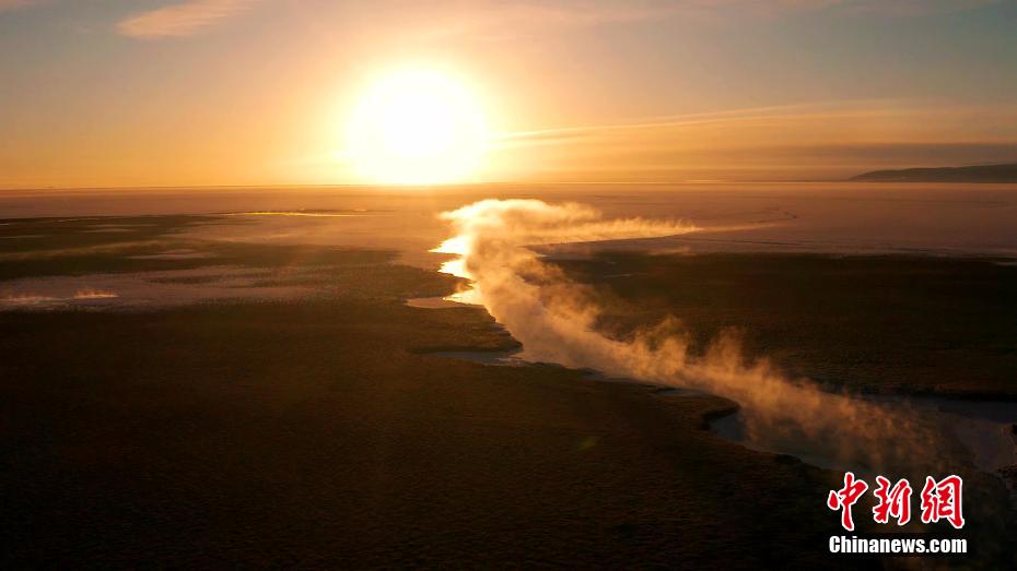 在冬日晨曦,初升的暖陽(yáng)下黑馬河水汽升騰,成群的大天鵝宛如仙子沐浴出水,畫面唯美。馬海青 攝