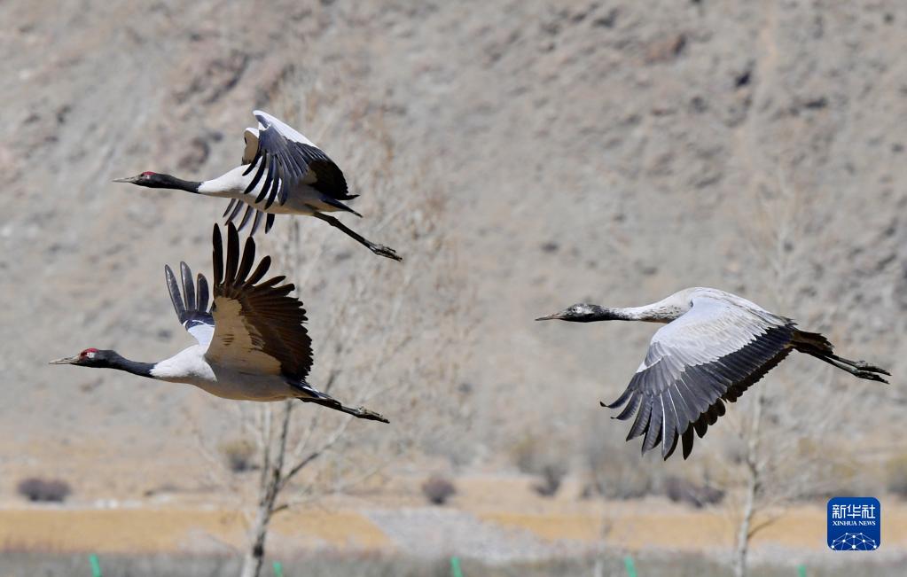 這是在南木林縣境內(nèi)拍攝的黑頸鶴(3月29日攝)。新華社記者 張汝鋒 攝