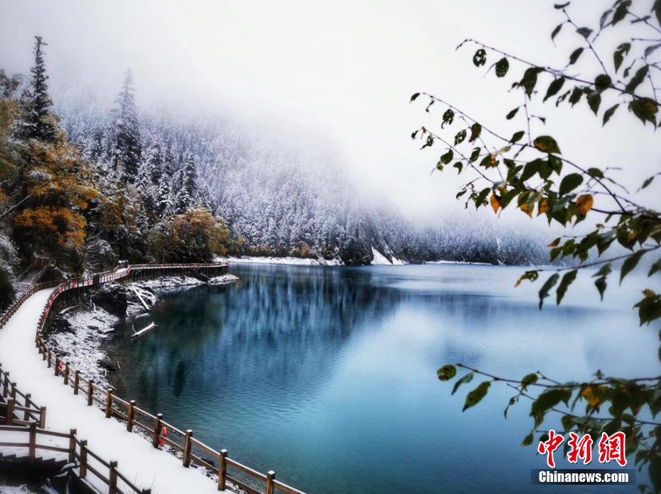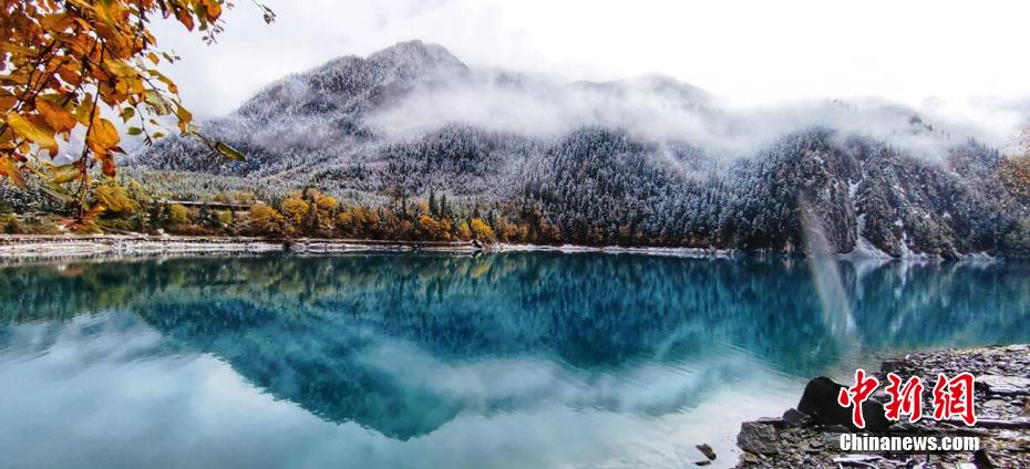 十月,九寨溝長海、原始森林等景點迎來入秋后的第一場雪。澄凈碧藍的海子和金色的彩林與潔白的雪花相映相襯,構成一幅靜謐的美麗畫卷。遠遠看去,成片的彩林被一朵朵雪花點綴,美得像童話世界一般。 梁峰 攝