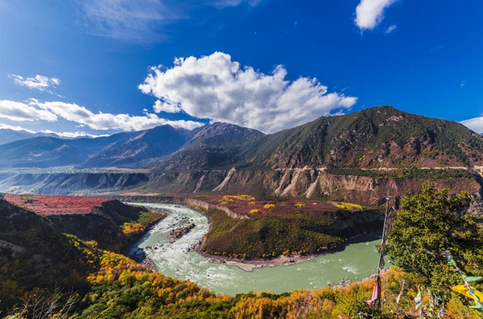 秋季的大峽谷由夏季單一的蔥蘢碧綠轉(zhuǎn)向秋季的五色斑斕。金色的松林、抬眼可見的冰川雪山,湛藍(lán)澄澈的天空,當(dāng)這一切倒映在碧綠的江水中,仿佛一幅生動的油畫。