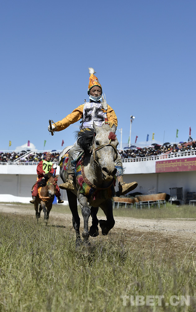 8月12日上午,西藏自治區(qū)那曲市2020羌塘恰青格薩爾賽馬藝術(shù)節(jié)的重頭戲——場內(nèi)速度賽馬比賽開始。賽道內(nèi),沙塵飛濺;看臺(tái)上,座無虛席,吶喊助威。