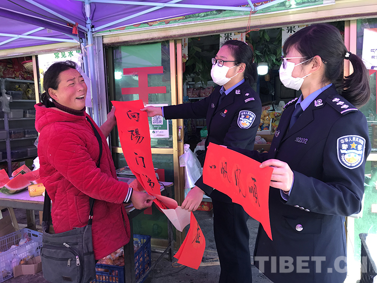 2月7日,拉薩邊檢站邀請(qǐng)拉薩市文聯(lián)書法家協(xié)會(huì)共同開展“同心同書——祖國(guó)新春好”送萬福進(jìn)萬家活動(dòng)。4名書法家揮毫潑墨,書寫漢文藏文春聯(lián),散發(fā)著墨香的春聯(lián)凝聚著無限的祝福。隨后,邊檢站格?;ㄅ訄?zhí)勤隊(duì)民警為駐地商戶送“福”送春聯(lián)。在駐地的一家超市,商戶張大姐興高采烈地與民警一邊貼春聯(lián),一邊笑著說:“感謝你們送來的新春祝福。今年雖然沒能回家過年,但有你們的陪伴照顧,我們感到很開心?!?/p>