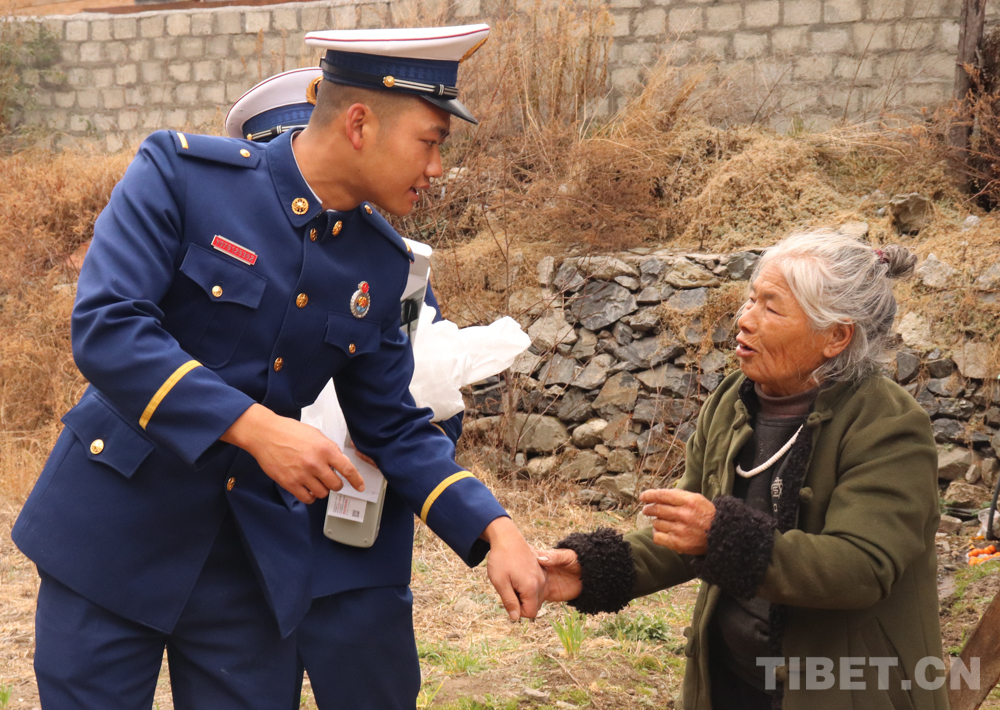 伴隨著冬日里溫暖的陽光,中隊指戰(zhàn)員代表帶著慰問品和節(jié)日的祝福來到了卓給阿媽家中,阿媽高興地迎接大家。指戰(zhàn)員們?yōu)榘審堎N對聯(lián)、整理衣物、收拾衛(wèi)生,給阿媽測量血壓,與阿媽拉家常,小屋沉浸在溫馨祥和的氛圍中。阿媽拉著指戰(zhàn)員的手說道:“謝謝你們經(jīng)常來看我,我雖然沒有兒女,有你們的掛念,心里很滿足。”臨走時,指戰(zhàn)員再三叮囑阿媽有困難一定要及時聯(lián)系,她的“兒子”會經(jīng)常來看望。