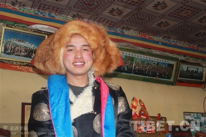 圖為身著藏族服飾的王卿龍?jiān)谖鞑剡^(guò)年