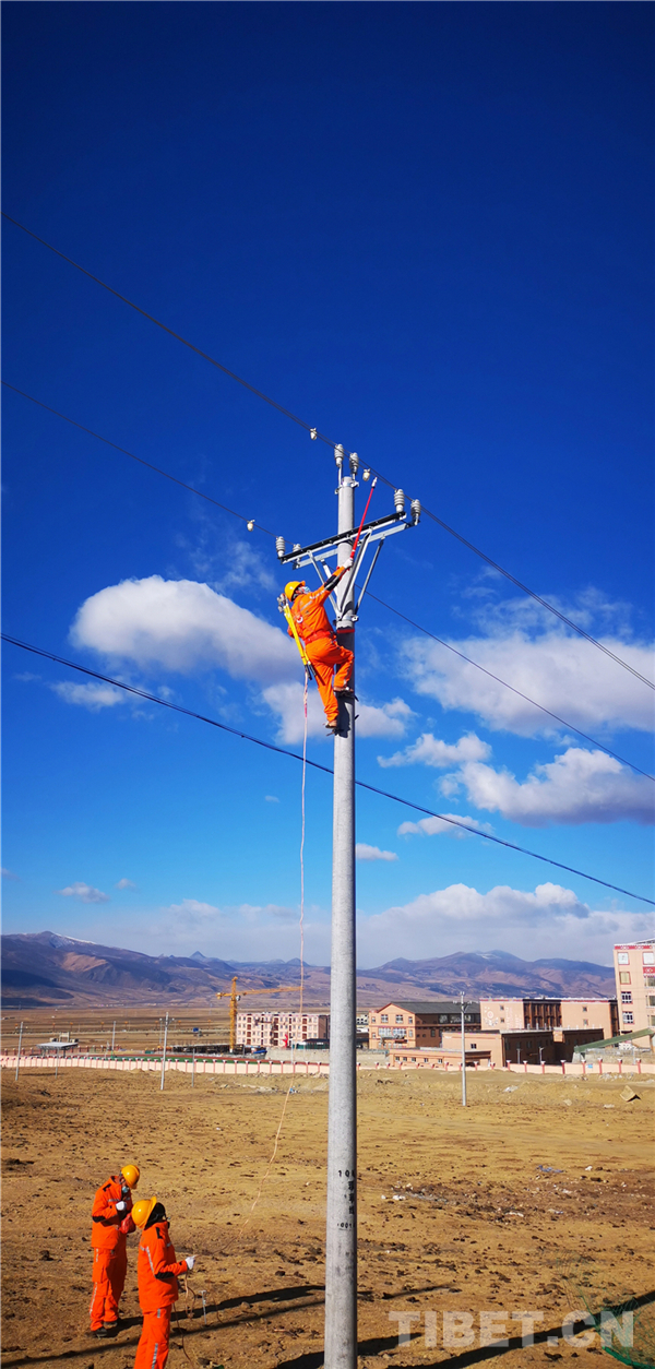 圖為國網理塘供電公司工作人員正在檢查電力線路 攝影:洛澤仁