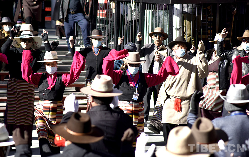 當(dāng)熱情的鍋莊舞曲傳遞到健身場地時(shí),老大爺?shù)職J云丹正講解完一個(gè)動作要領(lǐng),數(shù)著節(jié)拍帶領(lǐng)大家運(yùn)動起來。