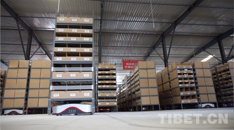 圖為西藏自治區(qū)級公共物流倉儲配送中心里,搬運(yùn)型機(jī)器人“地狼”投用