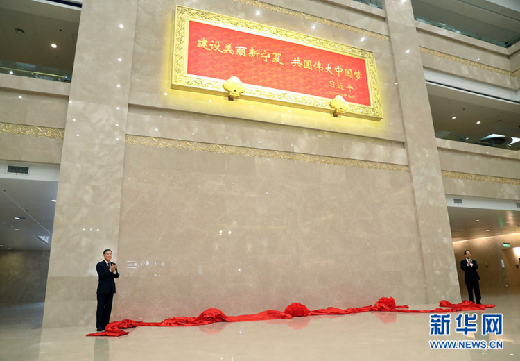 2018年9月19日,中共中央政治局常委、全國政協(xié)主席、中央代表團(tuán)團(tuán)長汪洋率中央代表團(tuán)出席向?qū)幭幕刈遄灾螀^(qū)贈送紀(jì)念品儀式。這是汪洋和時任寧夏回族自治區(qū)黨委書記、人大常委會主任石泰峰一同為習(xí)近平總書記題詞賀匾揭幕。攝影:新華社記者 劉衛(wèi)兵