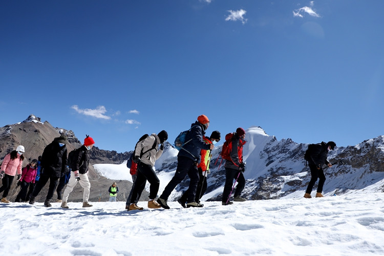 楊女士進(jìn)藏已有半月,在專業(yè)人士的協(xié)助下她第一次近距離接觸了冰雪世界,并攀登到了海拔5600米的地方?!敖裉煳覜]有高原反應(yīng),帶的氧氣也沒用。”在雪山上楊女士的興奮之情溢于言表。