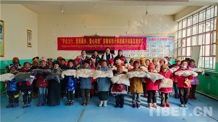 據(jù)了解,活動得到西藏自治區(qū)統(tǒng)計局、安徽省統(tǒng)計局、安徽省再貸款公司等單位企業(yè)以及愛心人士的積極響應,短短一個星期就購買到1013件羽絨服。為讓孩子們早日穿上羽絨服,援藏干部們決定立即將羽絨服送到古姆鄉(xiāng)小學。12月13日一早,他們一早就從拉薩出發(fā),日夜兼程,冒著零下二十多度的低溫大雪天氣,穿過十多個海拔5000米以上的埡口,行程1500多公里,終于在15日下午16點39分將羽絨服送到了孩子們手中,讓207名孩子在零下30多度寒冬中感受到了春天般的溫暖。