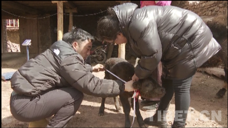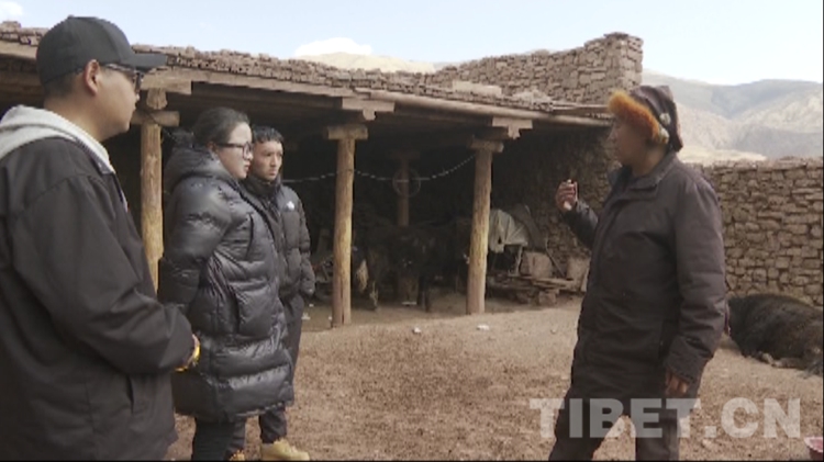 圖為貢覺縣畜牧站工作人員給村民索朗桑布指導飼養(yǎng)保暖措施