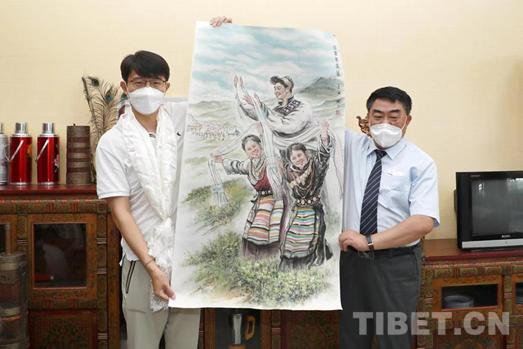 “我愛人看到了咱們館(西藏文化博物館)發(fā)的征稿啟事,然后就把這條信息發(fā)到家庭群里邊。過了不久,我父親說他畫了一張畫,讓我看看畫得怎么樣。我當時還很意外,本來想鼓勵我兒子畫一張,結(jié)果我兒子沒畫,老爺子畫得還很好?!?月21日,張兆林先生將自己的作品《哈達寄深情》捐贈給西藏文化博物館,張兆林之子張安誠將作品送至博物館并收到了捐贈證書。