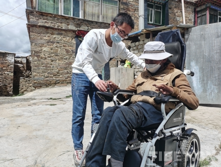 圖為閆磊贈(zèng)送村民仁增頓珠電動(dòng)輪椅。