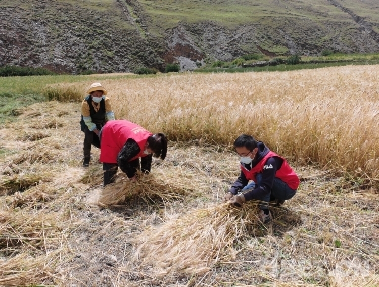 圖為閆磊(右一)幫助困難戶(hù)秋收。