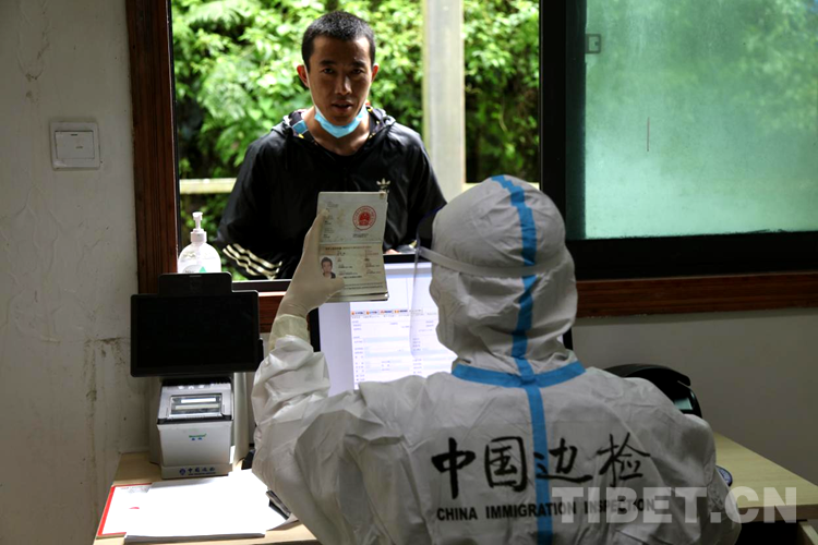 圖為民警正在對(duì)通關(guān)車輛司機(jī)進(jìn)行人證對(duì)照 攝影:尼瑪?shù)┰?/p>